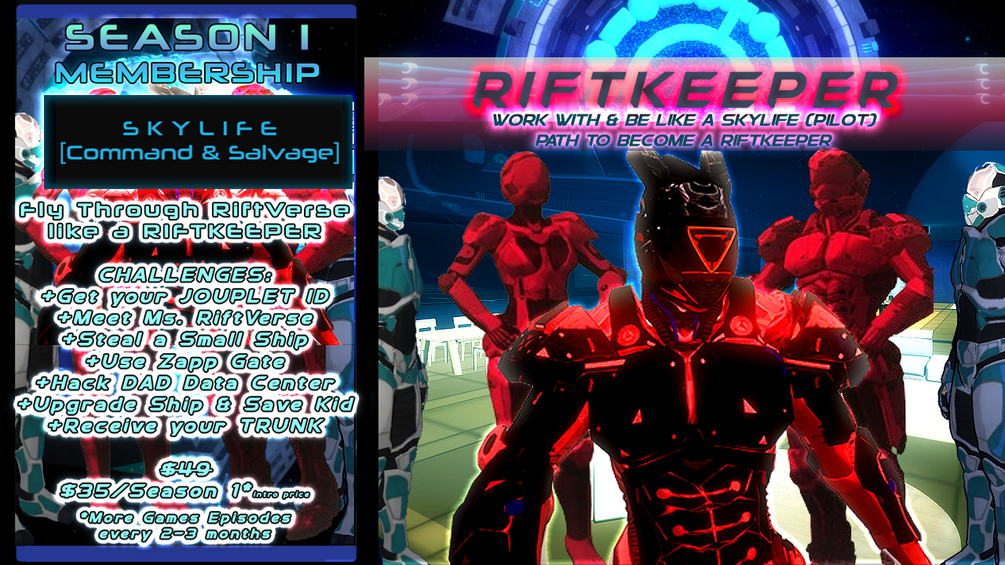 Join Season 1 for $9/month and gain monthly access to all 10 episodes released during Season 1. Enjoy exclusive perks such as early access to new releases, behind-the-scenes content, and community events. Work with and live like a SKYLIFE (Pilot) in this expansive universe of RiftVerse as on the Path to become RIFTKEEPER (HyprGate Captain). Plus, you will get access to not 1, not 2, but 10 entire Games aka Episodes of RiftVerse - Season 1!